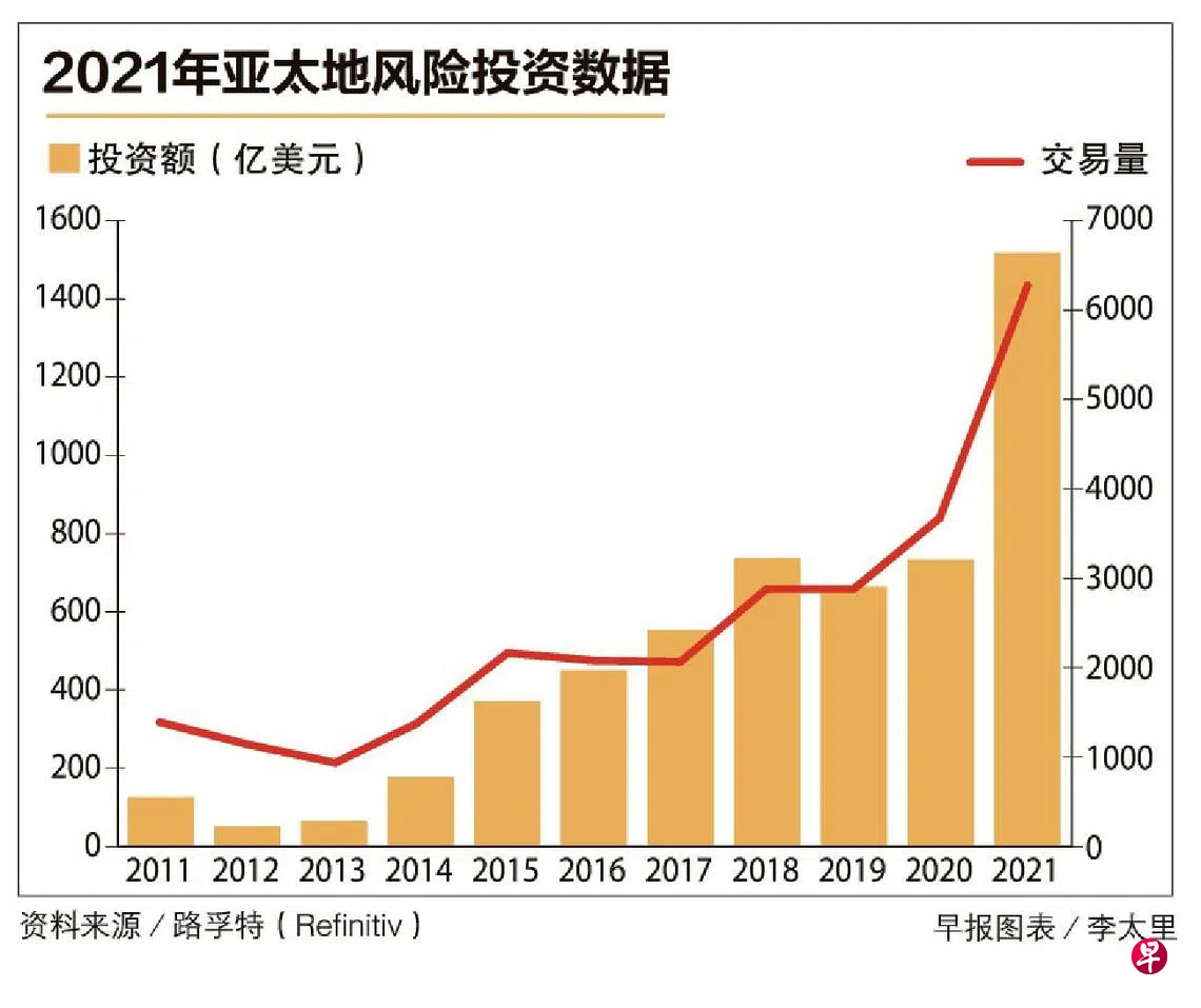 报告显示,2021年亚太地区风险投资额为1522亿美元,共6272笔交易。