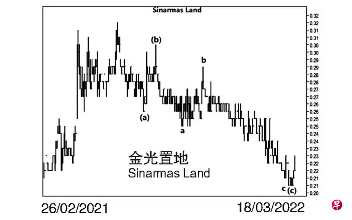 本栏于去年9月18日曾预估这只股票三波回扯中的(c)波或将在0.21元的价位完成。因此。填补介于0.215元与0.21元间的缺口自不在话下。当时股价为0.265元左右。9月21日股价下试0.25元,次日,股价再试此价位未果,遂于当天以“转向”信号完成了图中的a波,接着以三细波缓缓回扯。10月19日股价骤然上升至0.28元,由于升势甚急,造成介于0.265元与0.255元间出现缺口。20日股价更升试0.29元,旋结束了b波,并立即进入c波跌势。10月28日股价下跌至0.26元,随即将上述第二个缺口的一部分填补;11月29日股价进一步下滑至0.255元,遂将此缺口全予填补。12月21日股价下跌至0.24元,又将介于0.255元与0.245元间的缺口填补。今年3月9日股价下探0.21元,旋将上述第一个缺口填补;15日股价第三度试0.21元未果,就于该周每周一杆图以“主要转向”信号完成c波,同时为(c)波画下句号,随即止跌回升,截至3月18日股价已经上升至0.23元。估计升势当会继续,填补介于0.24元与0.255元的缺口也就理所当然。