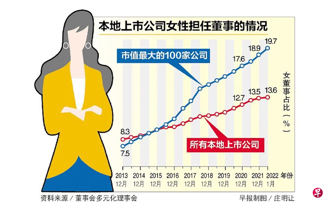 100家市值最大的本地上市公司的女董事占比有所提高,比率从2020年底的17.6%,上升至今年头的19.7%。