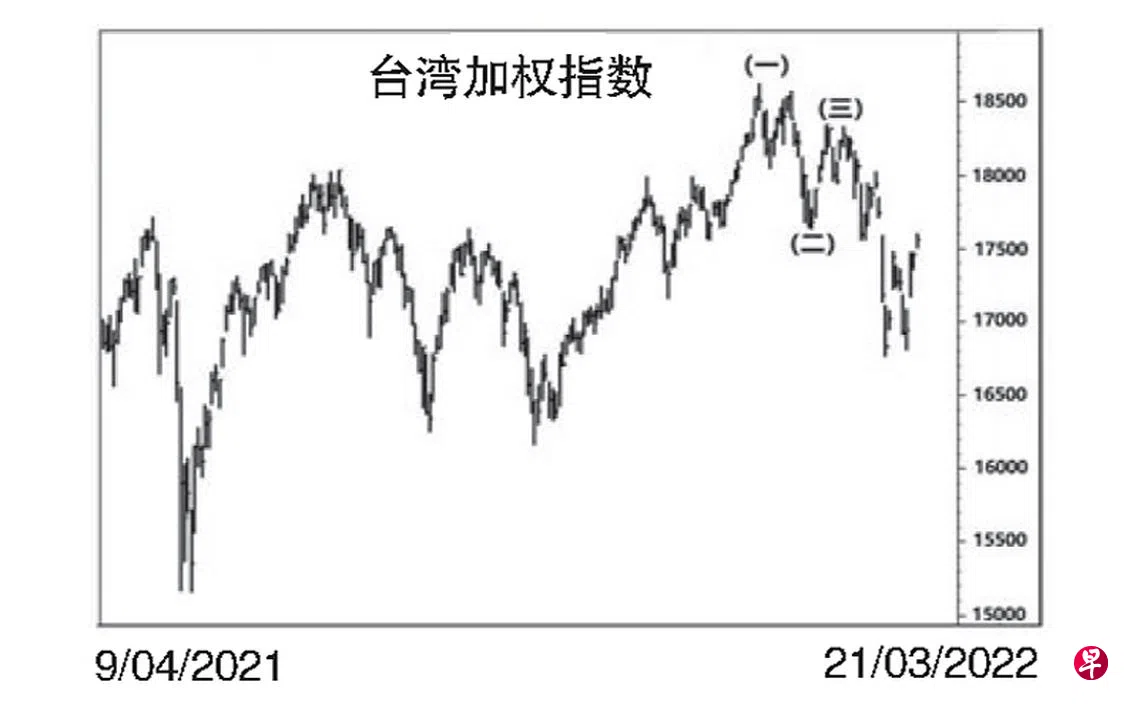 本栏于今年1月21日曾论及指数截至今年1月5日已经上升至18619.61点,几乎完成了位于18687.37点的基本目标;因此,估计指数随时会为第(五)点画下句号,并出现调整。当时指数为18227.46点左右。指数过后渐渐滑落并形成一个跌势“斜向交叉”,见报当天指数跳空下试17851.39点,由于跌势特急,造成介于18113.94点与18218.28点间出现缺口。1月26日指数下探17633.03点完成了上述“斜向交叉”中的第(二)点。2月10日指数回扯至18338.05点完成了第(三)点,随即缓缓下滑。24日指数跳空下试17561.07,又在介于17939.53点与18055.73点间留下缺口;3月3日指数回扯至18026.03点,随即将此缺口的一部分填补。3月4日指数下跌至17710.54点,旋在介于17845.01点与17934.40点间出现缺口。3月7日指数进一步直试17135.68点,又在介于17581.57点与17736.52点间留下缺口。截至3月8日指数已经下跌至16764.78点,遂止跌回升。估计短期回扯,指数当填补上述第四及第三个缺口,至于能否填补上述第二个缺口,那就难以逆料。