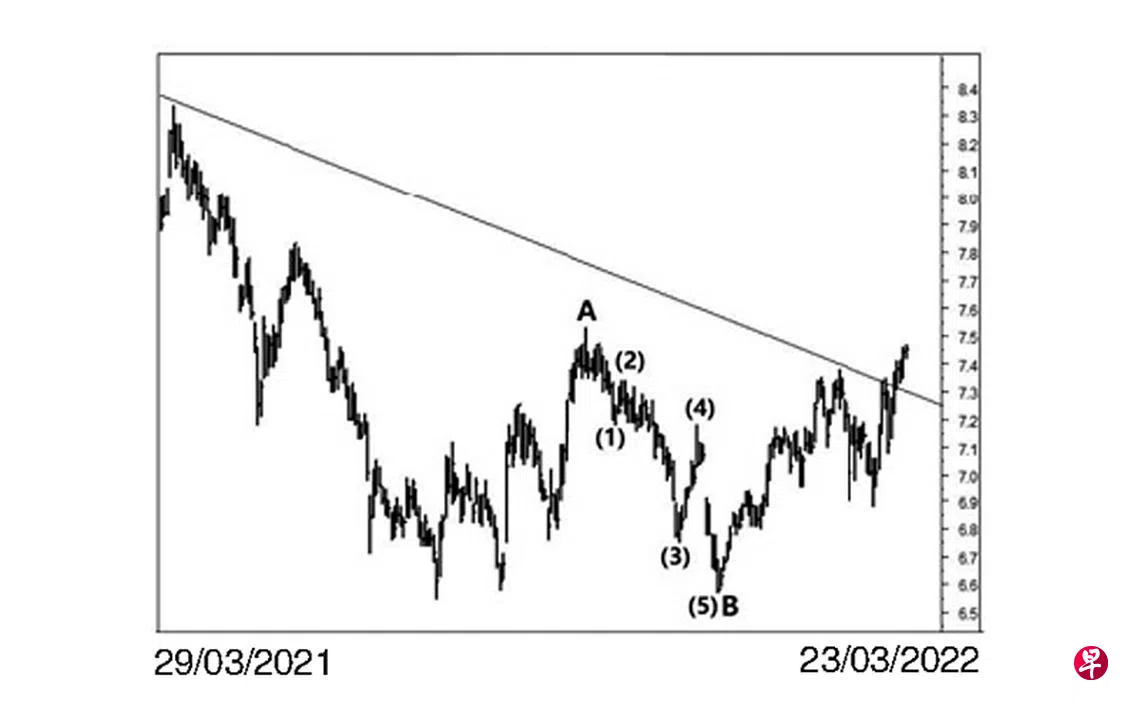 本栏于去年10月14日曾论及这只股票已经完成了一个“三角形”的第(4)点,至于能否升试7.78元的“三角形”上限则难以逆料。当时股价为7.29元左右。股价过后渐渐上升,同年10月20日股价升试7.53元完成了图中三波回扯中的A波,接着以五波缓缓下滑。11月3日股价下跌至7.18元结束了五波中的第(1)波,旋回扯至11月9日的7.34元,并于当天以“主要转向”信号完成了第(2)波。12月3日股价下跌至6.75元结束了第(3)波,随即回扯至12月13日的7.18元,此为第(4)波。12月16日股价骤然下探6.78元,由于跌势甚急,造成介于6.91元与7.07元间出现一个缺口。12月22日股价已经下跌至6.57元完成了B波,遂进入C波升势。今年元月14日股价上升至7.11元,旋将上述第一个缺口填补。随着时间的推移,此“三角形”的上限也渐渐下降,3月17日股价终于穿上位于7.35元的上限,23日股价更上升至7.47元。估计股价将升逾7.53元,并可能升试7.98元的阻力线以完成C波后,重返跌势。