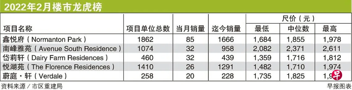 肯特岗公园(Kent Ridge Park)附近的鑫悦府(Normanton Park)继续是畅销榜冠军。该项目在上月以中位数每平方英尺1855元售出85个单位,比1月份的94个单位略减。