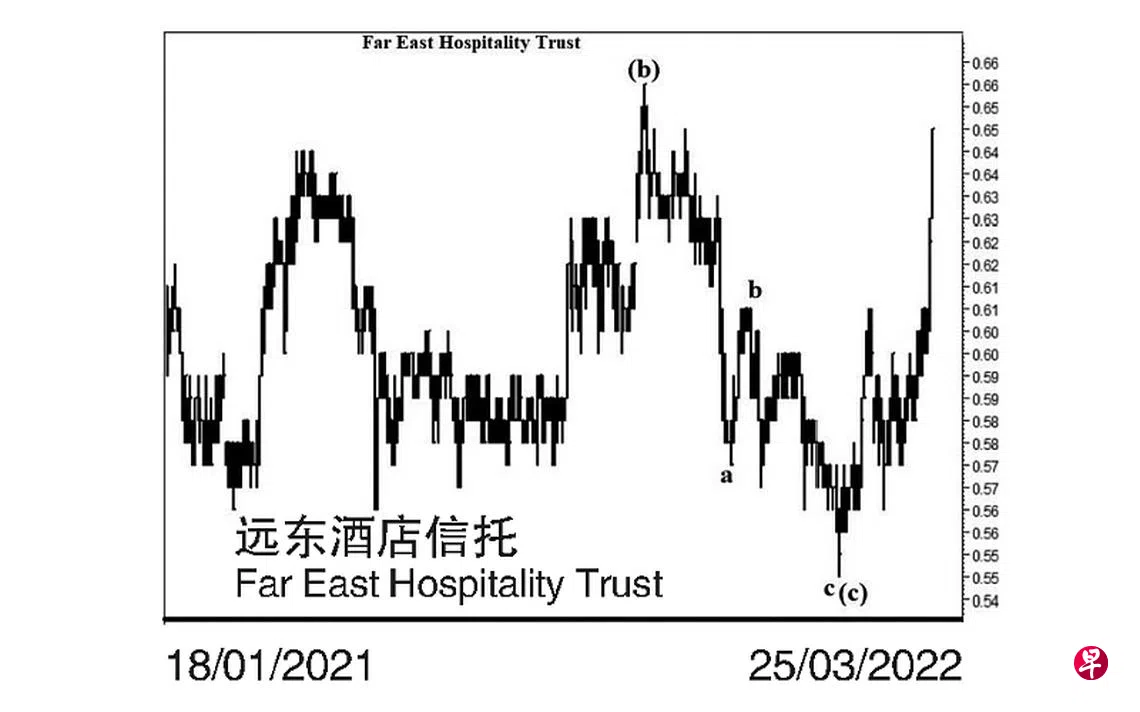 本栏于去年8月27日曾论及这只股票已经形成一个升势“三角形”。由于当时其“动力”信号随时都有可能突破“中性线”而进入正号界域,迄时股价将穿上0.63元的价位,朝0.74元的阻力线前进。当时股价为0.585元左右。果然。股价过后继续上升,9月2日股价一度升试0.62元,3日股价略升至0.63元。10月11日股价骤升至0.64元,由于升势甚急,造成介于0.625元与0.62元间出现缺口。10月14日股价上升至0.66元完成了图中的(b)波,遂以三波走势进入(c)波跌势,11月12日股价下试0.62元,立即将上述缺口填补。12月2日股价下跌至0.575元完成了图中的a波,过后回扯至12月8日的0.61元,接着三度试此价位未果,12月14日股价又试0.61元价位,随即以“主要转向”信号结束了b波。今年元月31日股价下探0.55元,较去年5月17日的0.565元来得低,遂完成了c波,同时为(c)波画下句号,重返升势。3月25日股价再度升逾0.63元的价位,直抵0.65元,估计上述0.74元的目标指日可待了。