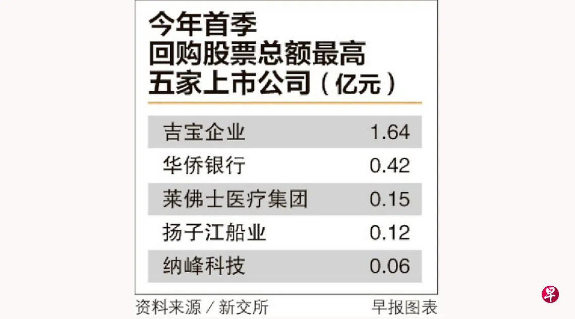 根据新交所的数据,44家上市公司进场回购股票,回购总额达2亿9838万元,高于去年同期的1亿3401万元。这些数据仅考虑第一上市挂牌公司,不包括第二上市公司的股票回购。其中,吉宝企业回购额最高,达1亿6418万元。