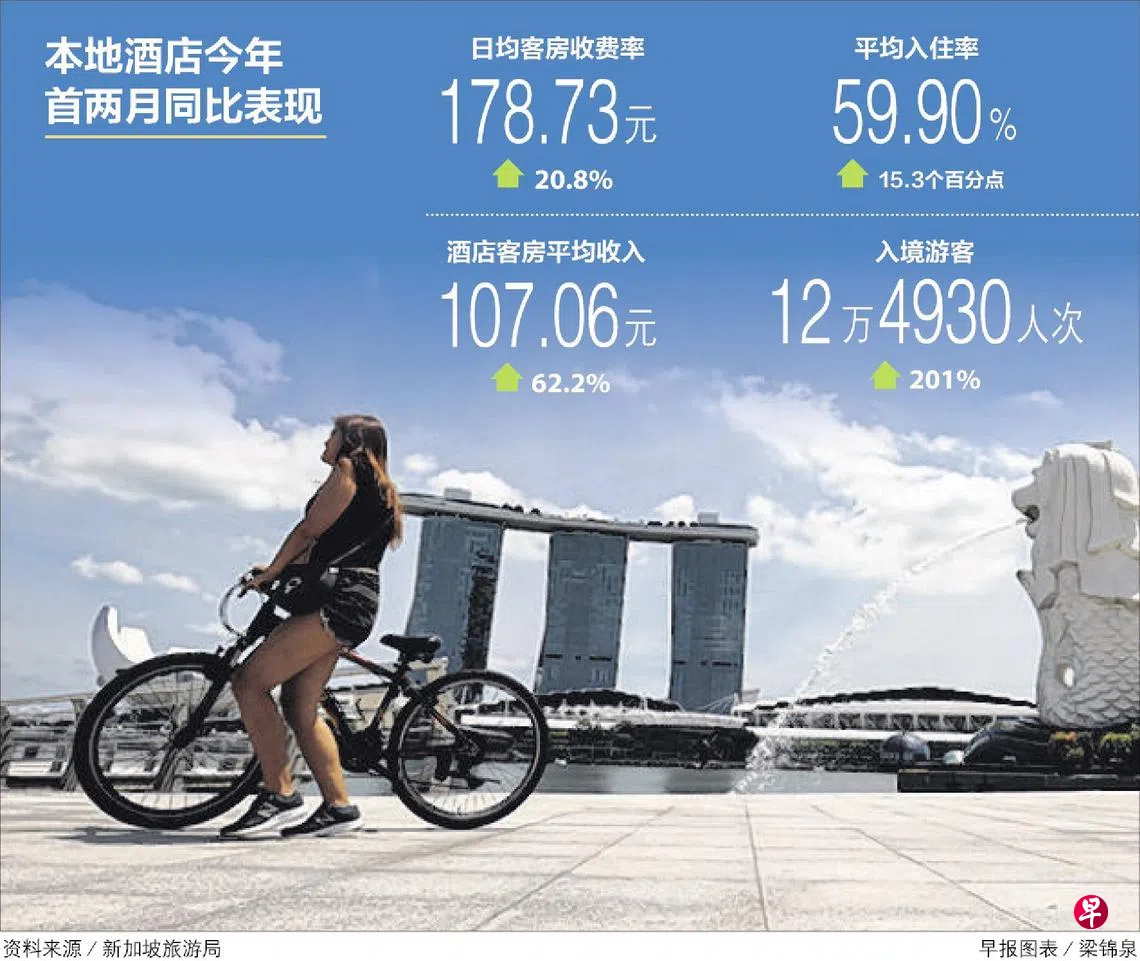 根据新加坡旅游局数据,我国今年首两个月共接待入境游客12万4930人次,同比翻了一番;分析师预料,随着我国放宽防疫措施和开放边境,酒店业表现将会在第二季加速改善。