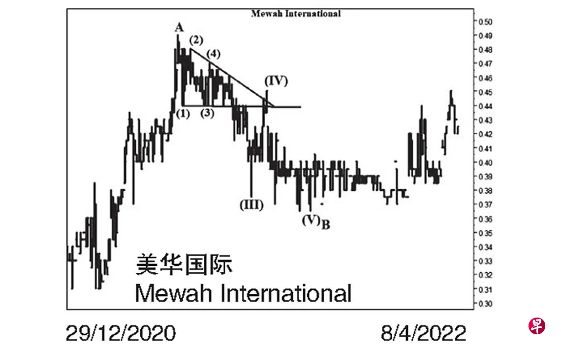 本栏于去年4月13日曾论及这只股票短期回扯,当向下填补介于0.365元与0.35元及介于0.33元与0.32元的缺口,过后重返升势,并当试0.665元的阻力点。当时股价为0.40元左右。同年5月10日股价上升至0.49元,随即于其每周一杆图以“转向”信号完成了图中的A波,过后以五波渐渐下滑。同年5月17日股价下试0.44元,并形成一个跌势“三角形”替代了第(I)及第(II)波。5月24日股价上升至0.48元,又于当天以“主要转向”信号结束了“三角形”的第(2)点。6月10日股价回落至0.44元,随即于当天以“主要转向”信号完成了第(3)点。6月15日股价上升至0.47元结束了第(4)点。7月28日股价下跌至0.375元完成了第(III)波;8月13日股价回扯至0.45元结束了第(IV)波。同年10月4日股价下探0.365元,遂于当天以“主要转向”信号完成了第(V)波,同时为B波画下句号。估计股价已经进入C波升势。短期回扯,充其量也只能填补介于0.405元与0.39元的缺口,过后重返升势。