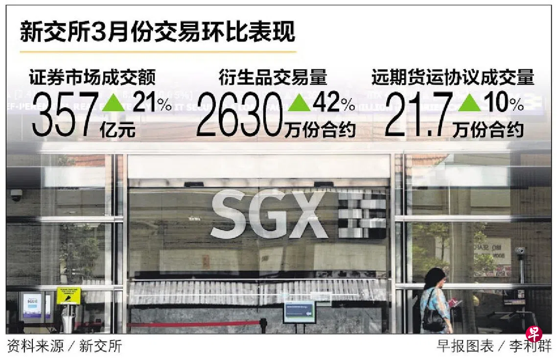 新加坡交易所(SGX)昨天发布最新数据显示,3月份整体证券市场成交额环比增长21%至357亿元,第一季成交额环比增长26%至910亿元。业绩增长主要因为衍生品交易量增长的推动。