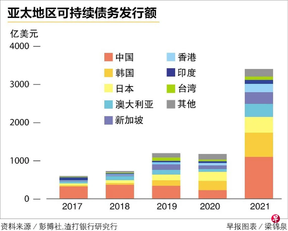 全球的绿色、社会、可持续及可持续发展挂钩(GSSS)债券发行额今年估计增长52%至1.7万亿美元(约2.3万亿新元),占全球债券总发行额的比重料从去年的11%增至18%。