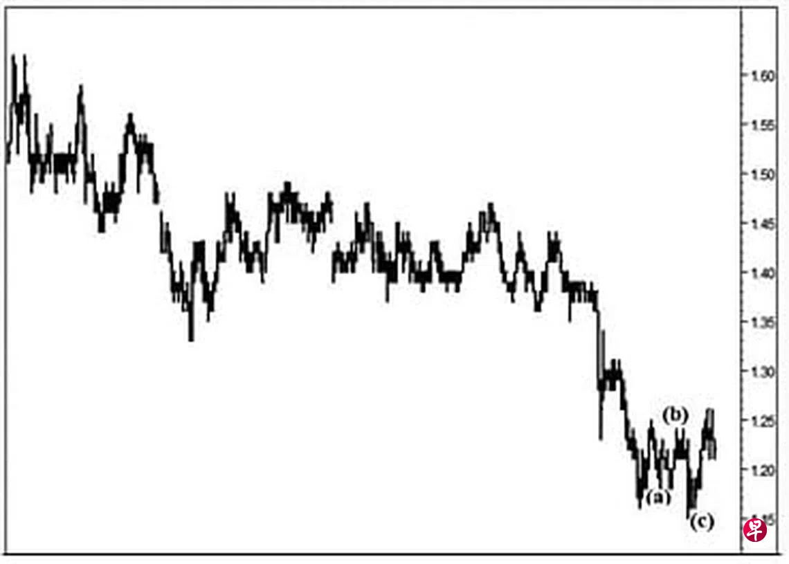 本栏于今年2月16日曾论及这只股票于元月27日跳空下试1.28元,造成介于1.36元与1.38元间留下缺口。短期回扯,股价当向上填补上述缺口,过后重返跌势。当时股价为1.26元左右,可是股价过后却渐渐下滑。见报当天股价下探1.23元,由于跌势甚急,造成介于1.27元与1.28元间留下缺口。2月24日股价下跌至1.16元,遂出现回扯,无奈力不从心,3月3日股价上升至1.25元,就重返跌势。3月9日股价下跌至1.18元,随即于当天以“主要转向”信号完成了图中的(a)波;3月18日股价上升至1.24元,并于当天以“转向”信号结束了(b)波,由于升势甚急,造成介于1.20元与1.18元间留下缺口。3月25日股价骤然下跌至1.15元完成(c)波,由于股价自今年3月1日的1.20元下滑至上述的1.15元,期间其每日一杆图中的“动力”信号,却从负号界域的0.54054上升至负号界域的0.11521处。估计股价短期回扯或将填补上述第二个缺口后重返跌势,一旦跌穿位于1.06元的支撑线,势必挑战位于0.98元的重大支撑点了。