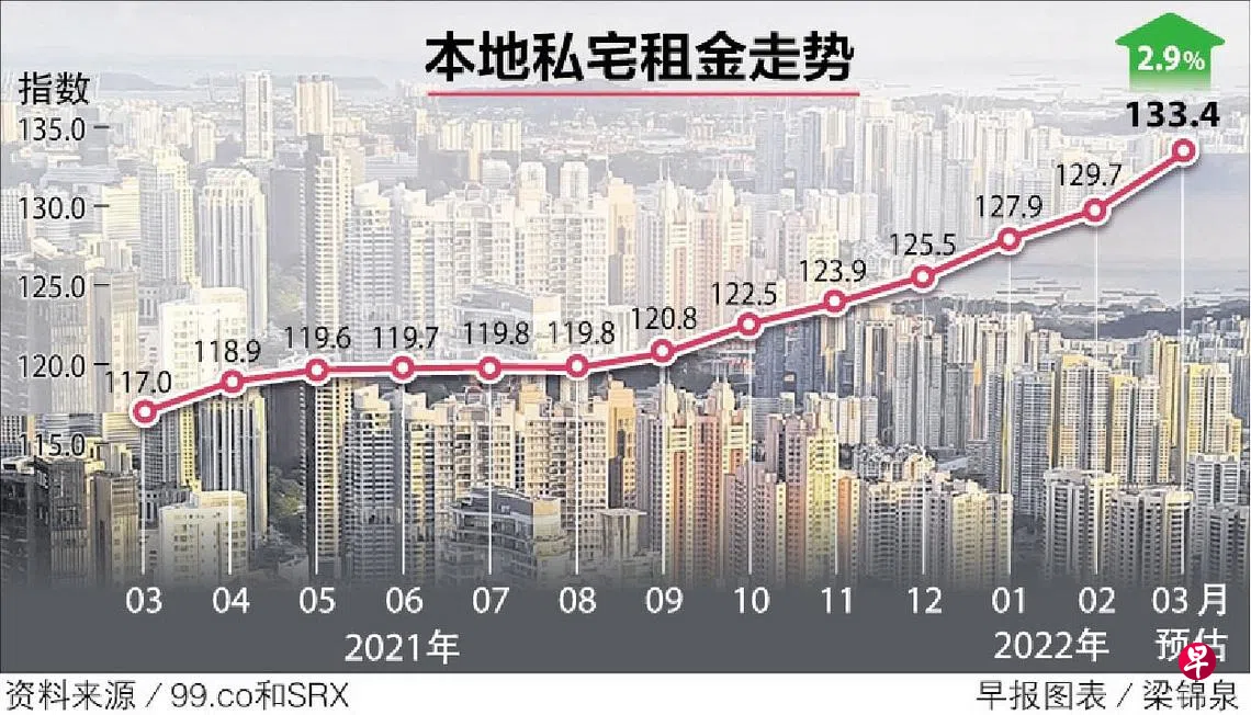 新私宅工程延误,供应有限应付不了租赁需求,本地私宅租金连续第15个月上升,今年3月份整体租金环比上扬2.9%,是有记录以来的最大涨幅。