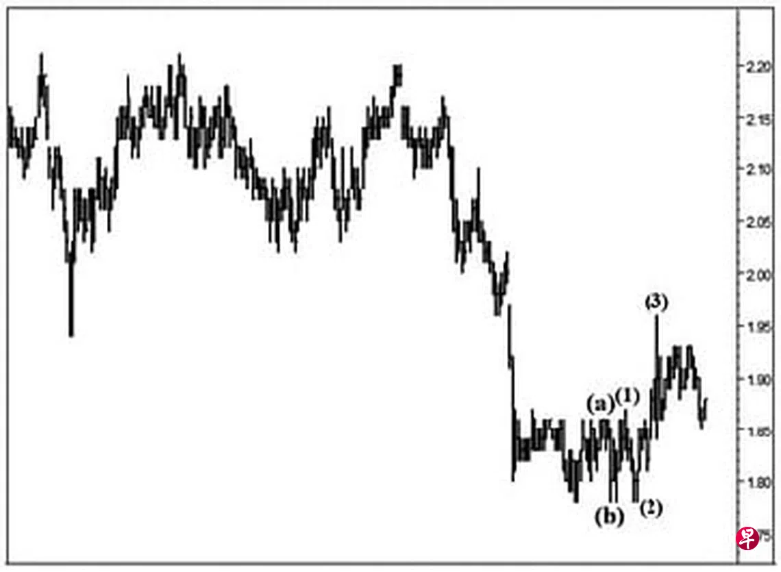 本栏于今年2月17日曾论及这只股票短期回扯或将填补介于1.97元与2.00元间的缺口,过后重返跌势。毕竟每月一杆图中的“动力”信号随时会穿下“中性线”而进入负号界域,迄时当带领股价进一步下跌。当时股价为1.85元左右。果然,股价过后以三波回升。2月21日股价略升至1.86元完成了图中的(a)波,接着回落至24日的1.78元,28日股价再度试此价位未果,遂结束了(b)波,旋以五波进入(c)波升势。3月3日股价上升至1.87元完成了第(1)波,随即回扯至3月8日的1.78元,此为第(2)波;过后一路挺升至3月21日的1.96元,无奈功亏一篑,未能将上述缺口填补,就为第(3)波画下句号,接着渐渐以一个升势“三角形”替代了第(4)波。因此,估计一旦完成,股价将进入第(5)波升势,以填补上述第一个缺口,并完成(c)波而重返跌势。何况其每月一杆图中的“动力”信号已经跌穿“中性线”进入负号界域,推动股价挑战1.71元的支撑点也就水到渠成了。
