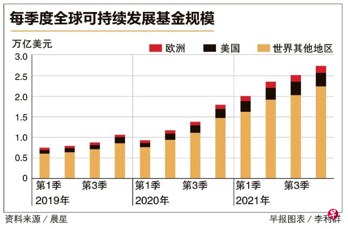 聚焦环境、社会与治理的基金去年共吸引至少6490亿美元(约8793亿新元)资金流入。ESG基金占全球基金资产规模将近10%。