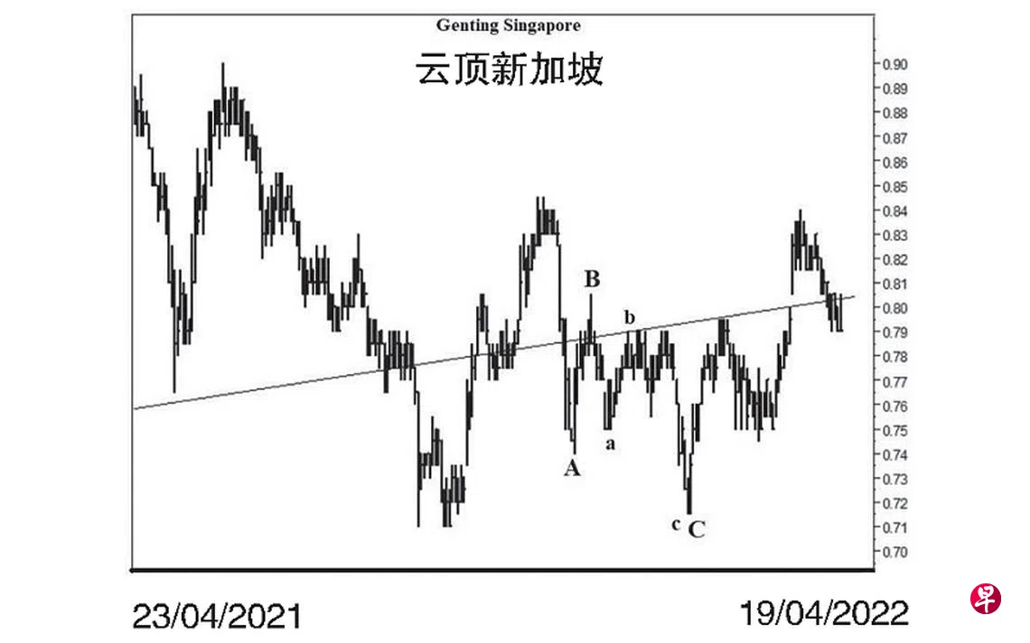 本栏于去年12月23日曾论及这只股票只要位于0.635元的支撑点能坚守,股价将升逾0.955元的价位。当时股价为0.75元左右。实际上,股价于去年12月21日的0.75元完成了上图中C波三波下调的a波,过后渐渐回升。同年12月30日股价上升至0.79元,并于当天以“转向”信号结束了b波,遂进入c波跌势。今年元月24日股价骤然下试0.76元,造成介于0.77元与0.775元间出现缺口。元月31日再度试0.715元后,随即以“主要转向”完成了c波,同时也为C波画下句号,旋止跌回升。2月8日股价上升至0.775元,遂将上述第一个缺口填补。3月24日股价跳空上升至0.83元,不但穿上上图颠倒“头肩形”的颈线,同时也在介于0.805元与0.795元间留下缺口。3月29日股价上升至0.84元,并于当天以“主要转向”信号进入调整。4月13日股价下探0.79元,旋将上述第二个缺口填补。估计只要位于0.715元的支撑点能坚守,股价当朝0.955元的目标前进。