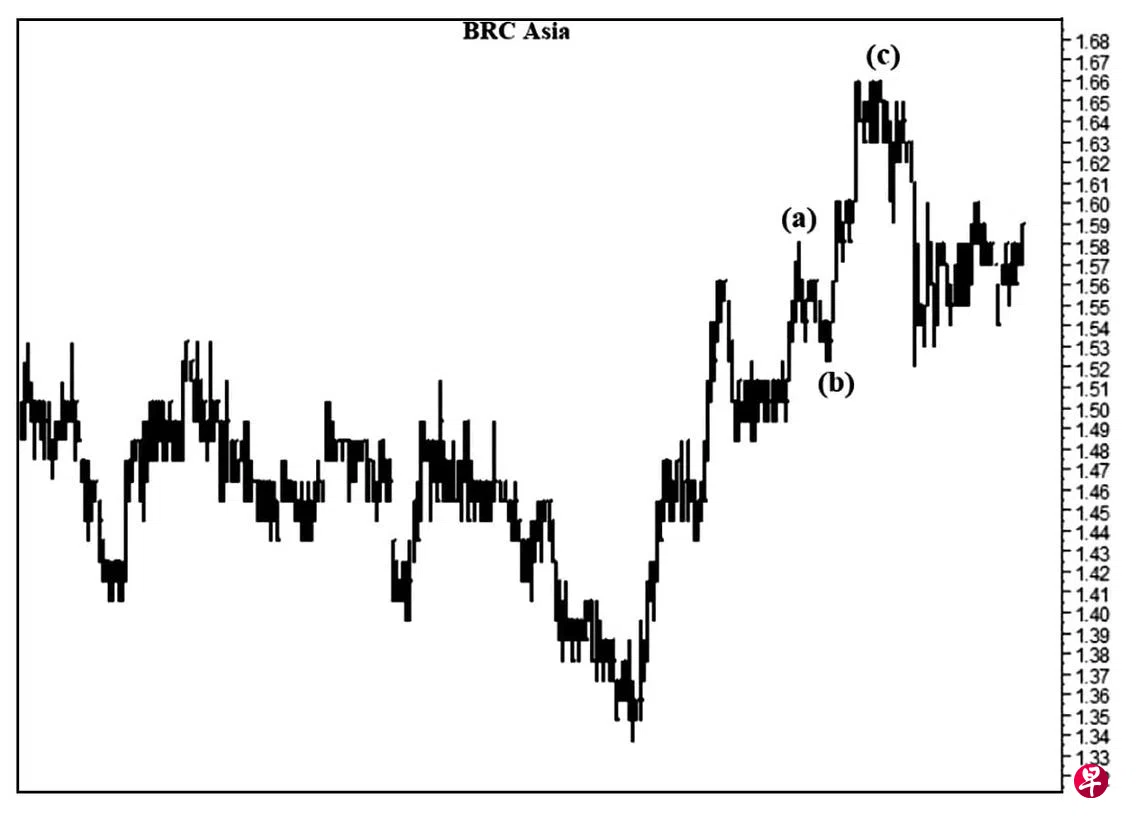 本栏于今年元月13日曾论及这只股票截至去年12月15日股价已经上升至1.60元,估计上升突破1.71元的阻力点将是理所当然,当时股价为1.54元左右。元月14日升试1.58元完成了图中的(a)波;接着回扯至元月26日的1.52元,次日,股价再度试此价位未果,随即于当天以“转向”信号结束了(b)波,旋止跌回升。元月28日股价跳空上升至1.56元,同时在介于1.54元与1.53元间留下缺口。元月31日股价上升至1.60元,2月9日股价第五度升试此价位,由于升势甚急,造成介于1.59元与1.58元间出现缺口。2月10日股价猛涨至1.66元,与上述1.71元的阻力线近在咫尺;无奈功亏一篑,2月21日股价第五度试此价位后,遂于当天以“转向”信号完成(c)波。3月7日股价直探1.52元,随即将上述第二及第一个缺口填补,同时又在介于1.61元与1.63元间留下缺口。4月11日股价骤跌至1.54元,造成介于1.56元与1.58元间出现缺口,4月21日股价回扯至1.59元,遂将此缺口。估计升势将持续,填补介于1.61元与1.63元也就理所当然了。
