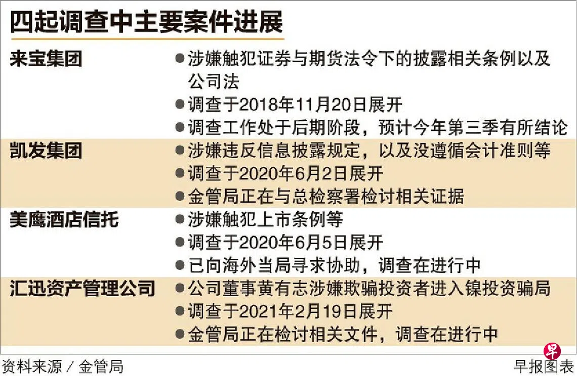 金管局在昨天发布的执法行动报告中,列出四起在调查中的主要案件的进展,包括来宝集团(Noble Group)、凯发集团(Hyflux)、美鹰酒店信托(Eagle Hospitality Trust),以及汇迅资产管理(Hui Xun Asset Management)。这是当局首次把正在调查中的案件的进展纳入报告中。