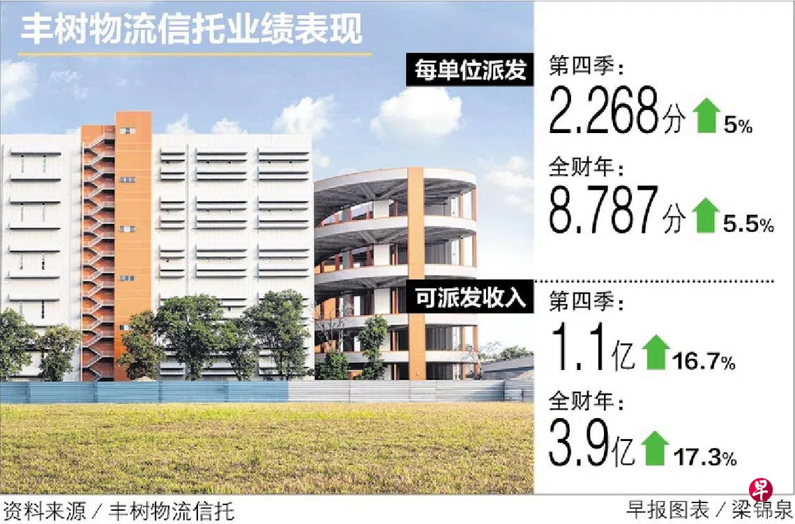 由于现有房地产营收增加、收购的房地产做出贡献,以及给予的租金回扣减少,丰树物流信托(Mapletree Logistics Trust)的第四季每单位派发(DPU)同比增加5%至2.268分,可派发收入上扬16.7%至1亿零801万元。