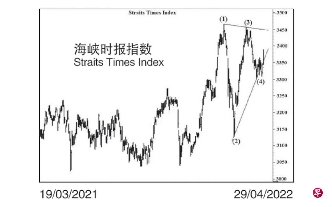本栏于上周一曾论及指数于图中“三角形”的第(4)点回扯,可能已经在3312.97点结束了。依此类推,指数一旦突破位于3451.30点的“三角形”上限,当有可观的升幅。当时指数为3361.11点左右。见报当天指数跳空下试3329.77点,遂在介于3356.66点与3361.11点留下缺口;由于当天最高为3356.66点,而最低却为3329.77点,因此,波幅较前一个交易日小,旋成了“幅内日”。4月26日指数一度下跌至3322.05点,27日更下探3308.03点,随即将介于3312.97点与3307.13点缺口的大部分填补。28日指数骤然上升至3344.24点,29日指数进一步地跳空上升至3389.64点,不但将介于3356.66点与3361.11点及介于3374.85点与3383.28点的缺口填补;同时又在介于3344.68点与3335.09点间留下缺口,估计短期回扯,指数或将填补此缺口,过后当上升填补介于3402.63点与3404.23点及介于3415.34点与3422.95点的缺口。究竟是什么原因驱使指数再度走高?这或许是因为目前亚太区疫情在一些国家,仍然无法获得有效的控制,加上疫苗种类及優劣有异,以致更向往新加坡,一个可以安身立命的地方。