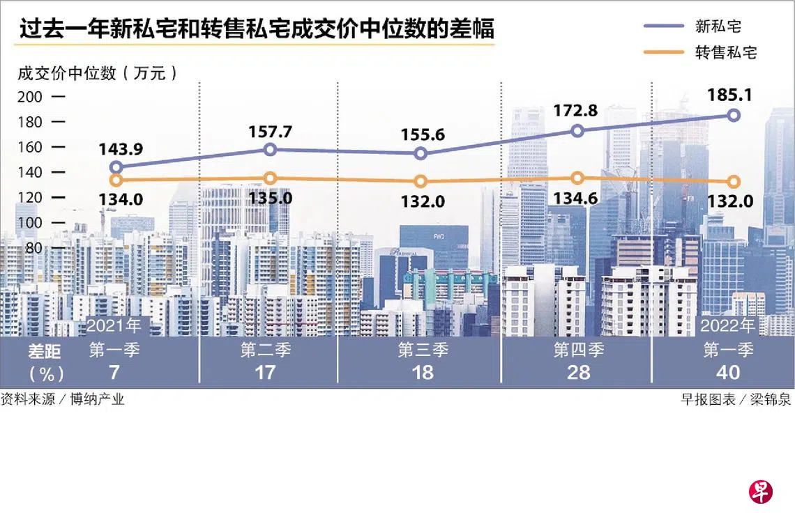 新住房供应短缺和购地成本上涨,推动新私宅成交价攀升,促使新私宅和转售私宅的价差在过去一年扩大,从去年第一季的7%增加至今年第一季的40%。