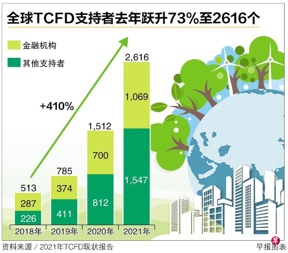 自2017年发布气候信息披露框架以来,TCFD获得越来越多金融机构和投资者的关注。全球TCFD支持者数量过去几年都逐步增加,并在去年跃升至2616个,比前年多73%。