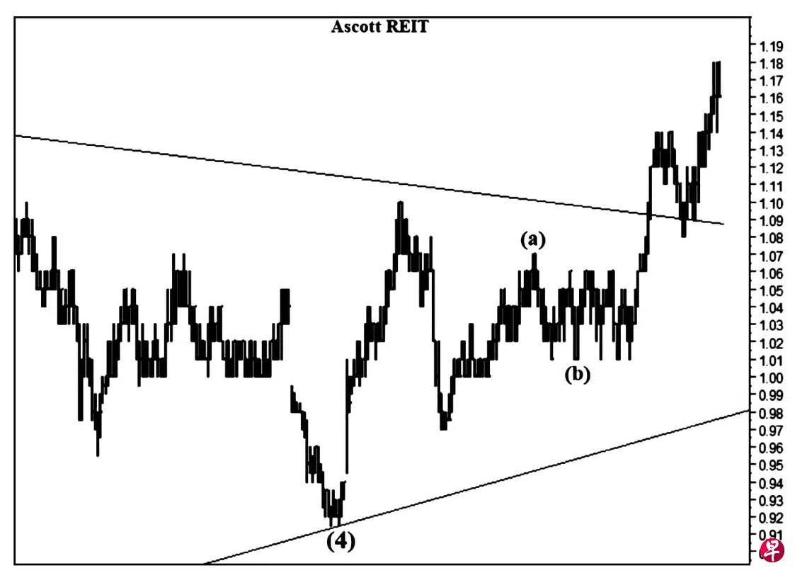 本栏于去年12月25日曾论及这只股票若以“斜向交叉”的第(三)与第(四)点的价差,计自第(五)点,可测得基本目标为0.875元。当时股价为1.01元左右。可是股价并没有下跌,反而渐渐上升。今年元月19日股价升试1.07元,20日再试此价位未果,旋于当天以“转向”信号完成了图中的(a)波;接着回落至28日的1.01元,2月15日股价第三度试此价位未果,遂于当天以“转向”信号结束了(b)波,随即进入(c)波升势。实际上,股价自2020年6月9日上升至1.17元,就于当天以“转向”信号完成了一个“三角形”的第(1)点;过后回落至同年11月2日的0.81元,此为第(2)点。2021年3月11日股价上升至1.14元结束了第(3)点,接着回落至同年10月6日的0.915元完成了第(4)点。今年3月24日股价上升突破位于1.09元的“三角形”上限,截至5月5日股价已经升试1.18元了。若以图中“三角形”的高,计自其上限,可测得目标为1.44元。