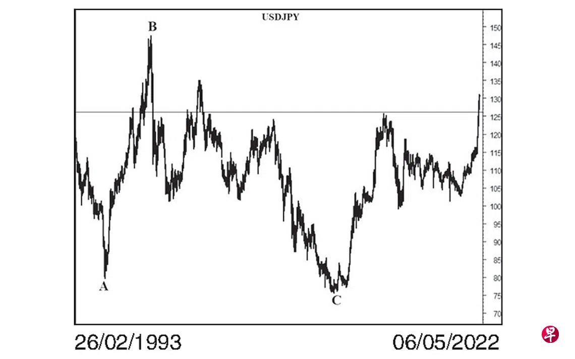 美元兑日元于2011年10月31日下跌至75.55日元的历史低价位,过后渐渐回升。2015年6月5日美元上升至125.85日元,并于该月每月一杆图以“转向”信号完成了一个颠倒“头肩形”的“头”,遂进入“右肩”下调走势。2016年6月24日美元一度下试99.08日元,过后几经反复,今年4月15日美元终于上升突破位于126.12日元的“颈线”,完成了图中的“右肩”。截至4月28日美元已经升试131.24日元,纵观美元兑日元的长期走势,其历史高位为1982年11月4日的277.65日元(经过美国联储局两年加息的结果),过后以五波下跌至1995年4月19日的79.70日元,完成了A大波,接着回扯至1998年8月11日的147.63日元,且于该月每月一杆图以“转向”信号结束了B大波,而C大波终于在上述的75.55日元的价位结束。因此,若以图中颠倒“头肩形”的高,计自其位于126.12日元的“颈线”,可测得基本目标为176.69日元。不知是否又是美国联储局加息后,历史重演。