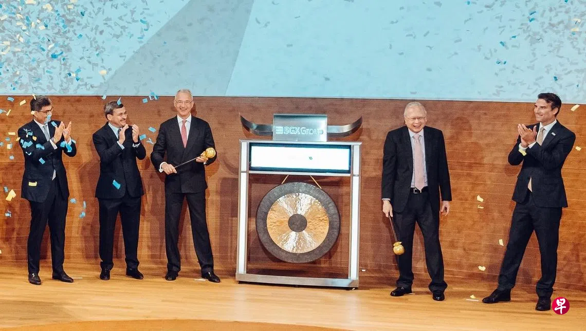 新交所集团(SGX Group)主席柯宗盛(右二)和瑞士信贷集团(Credit Suisse Group)董事长雷安泽(Axel Lehmann,左三),昨早在证券市场开盘仪式上一起敲锣,标志着边境和商务旅行的重新开放。新加坡是雷安泽今年出任瑞信集团董事长以来访问亚洲的第一站。新交所表示,雷安泽的到访,是瑞信和新交所集团长期合作关系的确证,双方在新加坡拥有近50年的成功伙伴关系。(新交所提供照片)