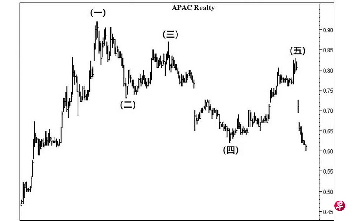 本栏于今年1月12日曾论及这只股票在介于0.70元与0.765元出现缺口。12月29日股价回扯至0.725元,遂将此缺口的一部分填补,估计股价当继续下滑,以填补介于0.58元与0.57元及介于0.54元与0.53元的缺口后,重返升势。当时股价为0.70元左右。见报当天股价下跌至0.68元,过后继续下滑至元月27日的0.62元,完成了一个跌势“斜向交叉”中的第(四)点,接着缓缓回升。2月23日股价骤然上升至0.70元,随即在介于0.66元与0.645元间出现缺口;3月9日股价回扯至0.65元,遂将此缺口的一部分填补,过后继续其升势。3月22日股价跳空至0.75元,并在介于0.72元与0.71元间出现缺口,接着一路挺升至4月22日的0.83元,结束了图中的第(五)点回扯。4月2日股价骤然下探0.695元,同时在介于0.725元与0.805元留下缺口。4月28日股价更进一步的跳空直试0.65元,又在介于0.67元与0.71元间留下缺口。截至5月10日股价已经下跌至0.60元。估计短期回扯,股价当向上填补上述第六及第五个缺口后,重返跌势。