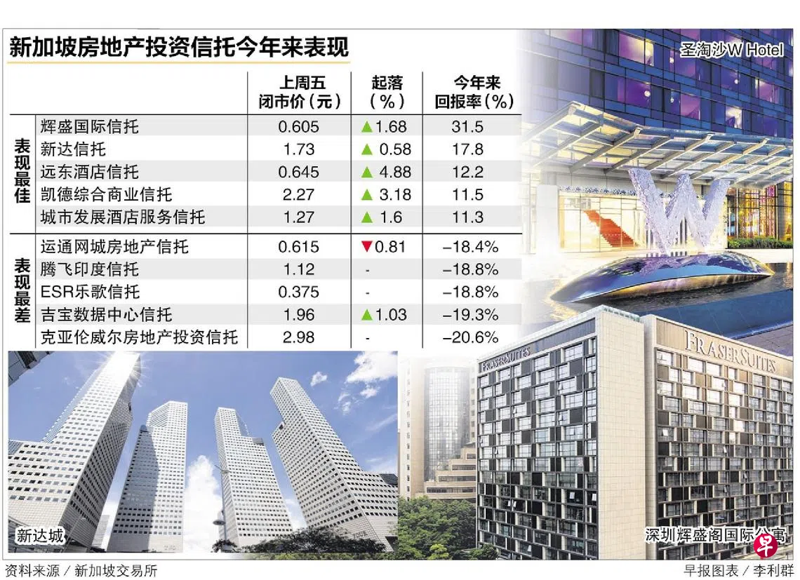 根据新加坡交易所提供给《联合早报》的最新数据,今年来总回报率最高的新加坡房地产投资信托(S-REIT)是辉盛国际信托(Frasers Hospitality Trust),总回报率高达31.5%,是亚太区表现最好的REIT。