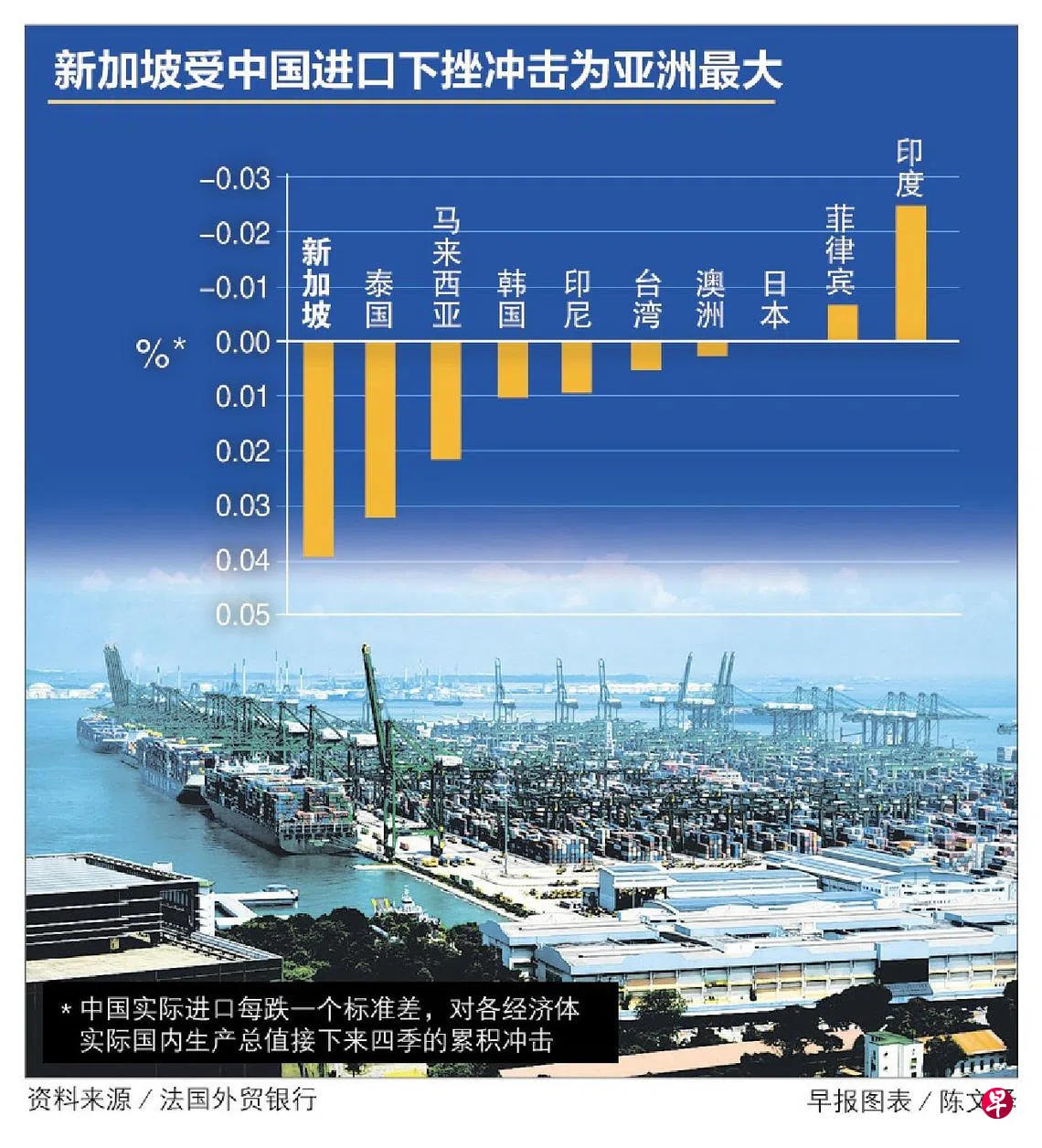 法国外贸银行(Natixis Corporate & Investment Bank)在最新发布的报告指出,中国进口需求放缓,新加坡预料是受最大冲击的亚洲经济体,其次是泰国和马来西亚。