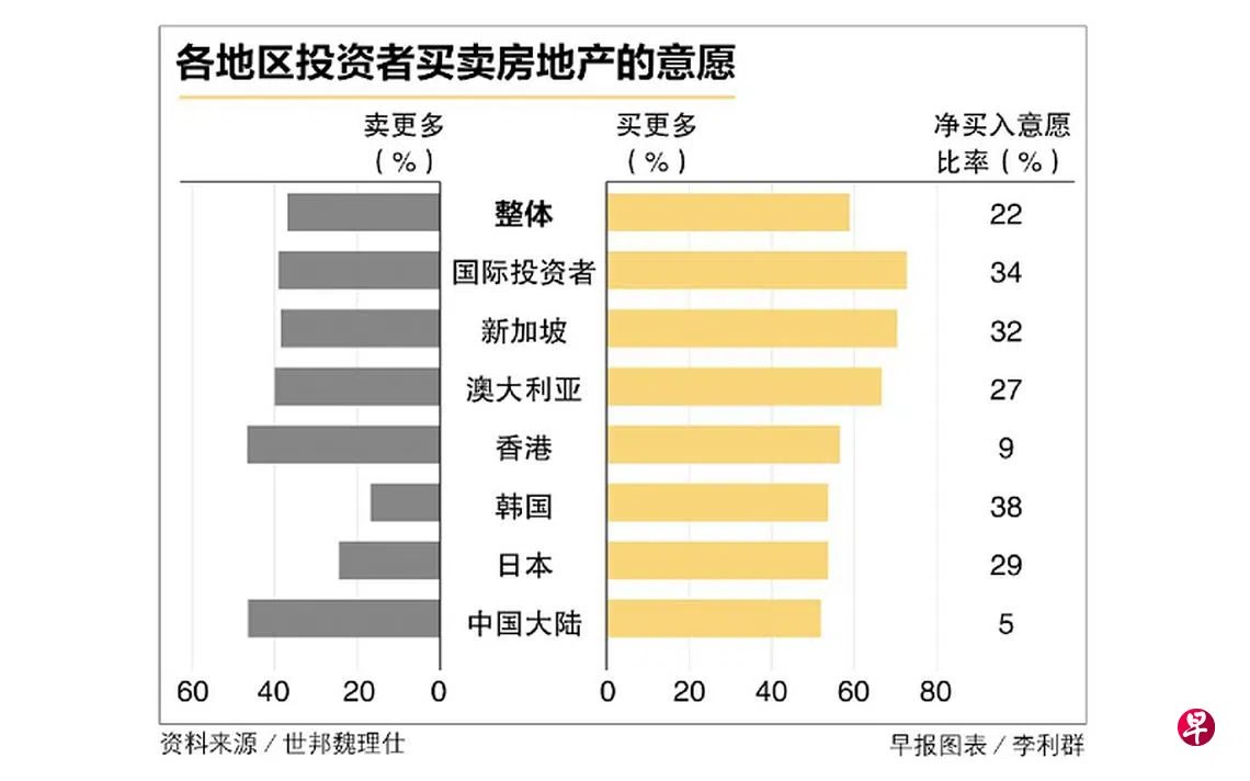 世邦魏理仕:仅次于韩国 新加坡人置业意愿亚太排名第二订户赠阅文章冠病疫情改善之际,新加坡投资者买入房地产的兴趣更加强烈,置业意愿在亚太区中排名第二,仅次于韩国。根据世邦魏理仕(CBRE)发布的2022年亚太区投资者意向调查,亚太区中,韩国投资者的净买入意愿比率最高,为38%。新加坡紧跟在后,比率为32%,日本排名第三,比率为29%。报告指出,由于整体投资欲望预计保持强劲,亚太商业房地产的投资成交额今年可能上升5%到10%,达到1500亿美元(约2090亿新元)。如果预测成真,这将是本区域历来的最高纪录。世邦魏理仕房产上一篇美元兑泰铢下一篇东证期货国际成为 ICE新加坡交易所会员购买此文章