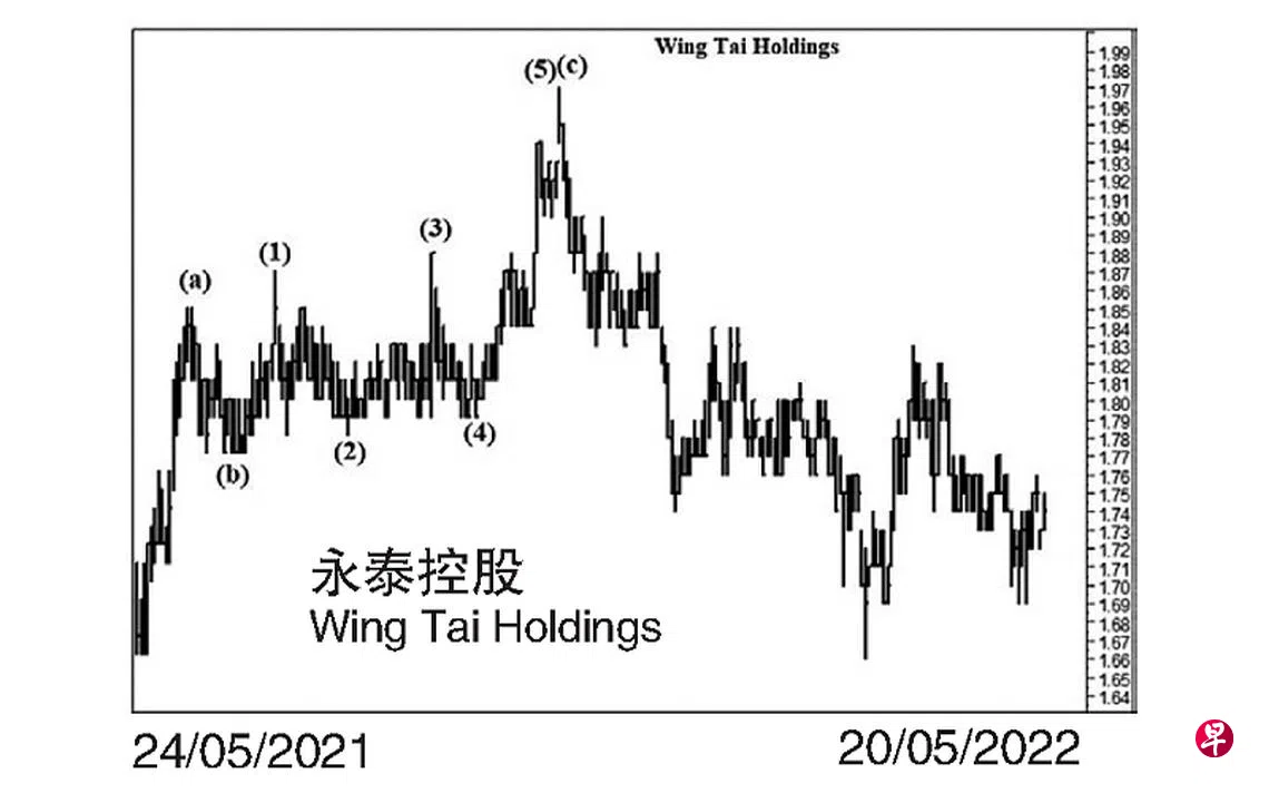 本栏于去年6月10日曾论及这只股票截至5月24日股价下跌至1.68元后止跌回升,可惜回升乏力;何况位于1.87元的阻力线已成天堑,一旦穿下1.63元,当有骤跌。当时股价为1.79元左右。同年6月14日股价上升至1.85元,15日股价再试此价位未果,遂于当天以“主要转向”信号完成了(a)波,过后于6月28日下探1.77元,7月6日股价再试此价位未果,旋以“主要转向”信号结束了(b)波,就缓缓进入一个具五波的(c)波升势。7月16日股价上升至1.87元完成了上图中的第(1)波,过后回扯至8月17日的1.78元,此为第(2)波。同年9月17日股价上升至1.88元结束了第(3)波,同时突破了上述位于1.87元的阻力线。10月5日股价回扯至1.79元完成了第(4)波,而第(5)波终于在11月8日的1.97元结束,同时于该周每周一杆图以“主要转向”信号为(c)波画下句号,随即重返跌势。今年3月8日股价一度下探1.66元,估计跌穿1.63元的支撑线将是指日可待了。