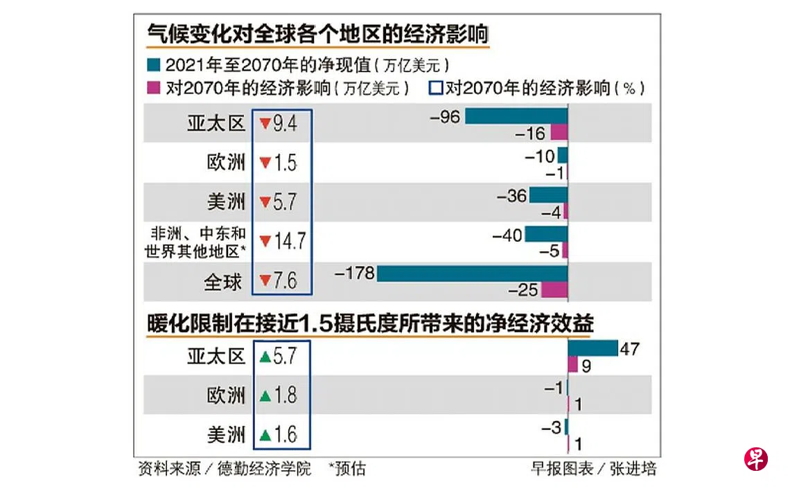 如果不加以控制,气候变化可能在未来50年内使全球经济损失178万亿美元(约245万亿新元),仅仅在2070年全球国内生产总值会因此减少7.6%。