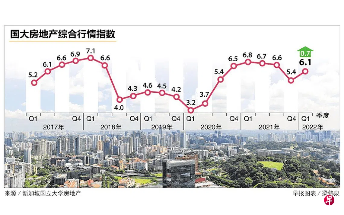 新加坡国立大学房地产(房地产系和房地产与城市研究院的统称)昨天联合发布今年第一季房地产行情指数(Real Estate Sentiment Index,简称RESI),反映整体房地产行情的综合行情指数(Composite Sentiment Index)从前一季的5.4,上升至6.1。