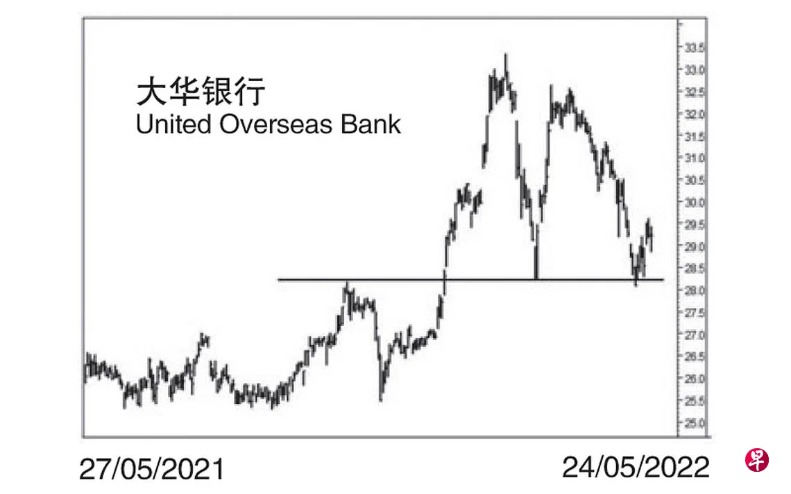 本栏于今年1月1日曾论及这只股票截至去年11月30日已经下探25.47元,由于跌势甚急,造成介于26.93元与27.11元出现缺口。12月17日股价回升至27.18元,遂将此缺口填补。当时股价为27.00元左右。1月4日股价跳空升试27.60元,同时在介于27.11元与26.93元留下缺口。7日股价再接再厉骤升至28.43元,又在介于27.88元与27.70元留下缺口,1月10日股价更进一步上升至29.20元,遂在介于28.53元与28.29元留下缺口,过后继续上升。2月3日股价再度跳空直奔31.27元,随即在介于30.75元与29.96元留下缺口。2月17日股价升抵33.33元的历史高点,遂迅速回落。3月9日股价已经下跌至28.20元,不但将上述第四及第三个缺口填补,并于当天以“主要转向”信号止跌回升。3月17日股价上升至32.62元完成上图中“双峰形”中的第二峰。截至5月12日,股价已经跌穿位于28.20元的颈线下探28.08元。短期回扯,股价当向上填补介于30.50元与30.56元及介于30.94元与31.13元的缺口后,重返跌势。