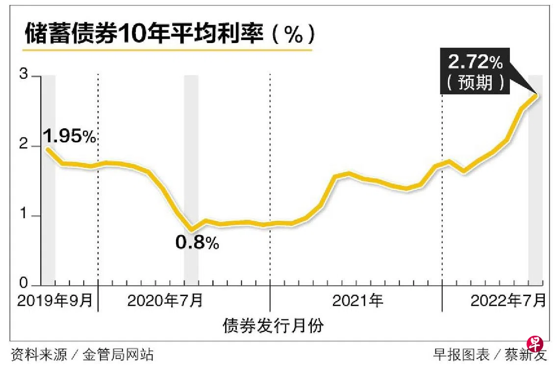 《联合早报》根据新加坡金融管理局网站提供的新加坡政府债券收益率、截至5月30日的数据计算,7月发行的储蓄债券(Singapore Savings Bonds)10年平均利率预计可达2.72%,首年的利率约1.69%。