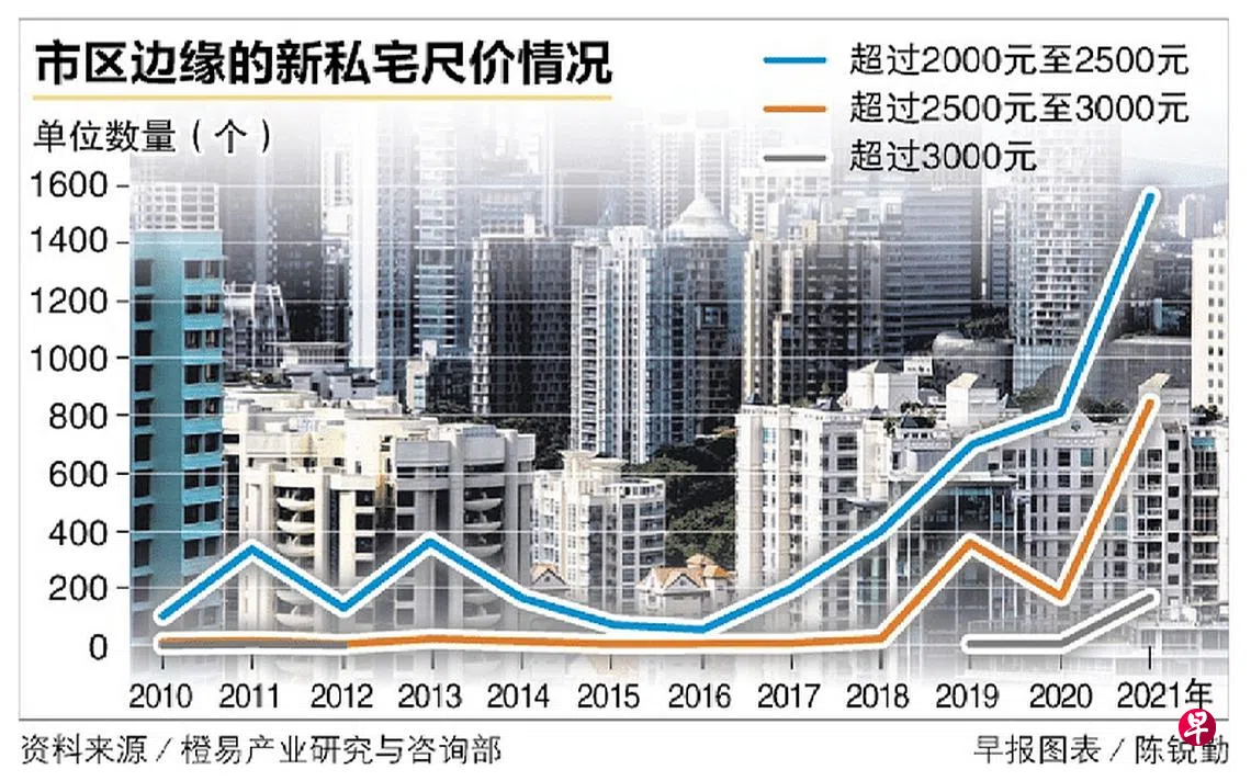 市区边缘的私宅价格近期快速上升,这个地区有越来越多新私宅的尺价超过2500元,有的房价甚至超越豪华私宅。