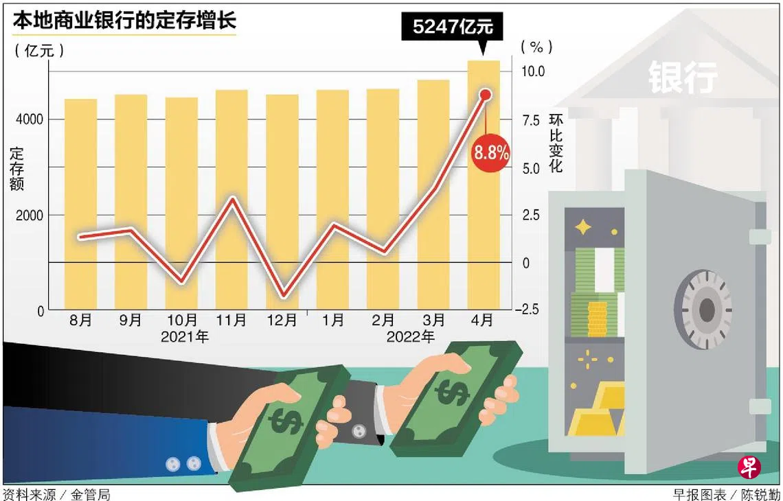 辉立证券研究部投资分析师谭鉫澄接受《联合早报》访问时说,本地居民定存4月份比3月份增长6.3%,达2606亿元。这是因为银行提供的利率是冠病疫情来最高;此外,定存保障也吸引了人们,在目前不明朗的经济环境下,定存最为稳妥。