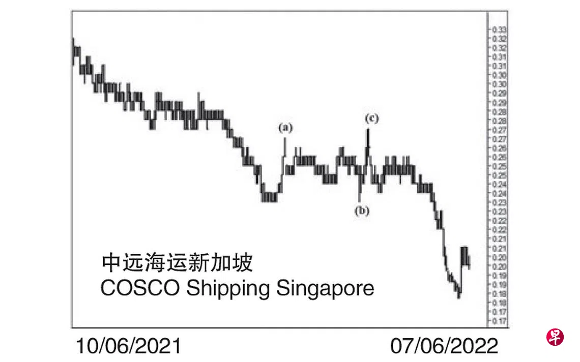 本栏于去年8月18日曾论及这只股票当时正处一个“斜向交叉”的第(五)点回扯,一旦结束,股价将重返升势,并可能试位于0.52元的基本目标。当时股价为0.28元左右。8月25日股价上升至0.295元,过后又两度试此价位未果,8月30日股价第四度试此价位后,遂于当天以“转向”信号进入跌势。9月20日股价下跌至0.275元,过后几经反复,股价于10月1日回升至0.295元,无奈只是昙花一现,旋缓缓回落。去年11月29日股价下试0.235元,并于当天以“转向”信号进入回扯走势,12月17日股价上升至0.27元完成了(a)波,接着回扯至今年2月24日的0.235元,此为(b)波。3月4日股价上升至0.275元,且于当天以“转向”信号结束了(c)波,随即重返跌势。5月5日股价终于跌穿位于0.235元的支撑线下探0.23元。截至5月27日股价已经下跌至0.182元,短期回扯,股价或将止于0.235元的阻力线;估计股价一旦跌穿0.179元的支撑点,当有骤跌。