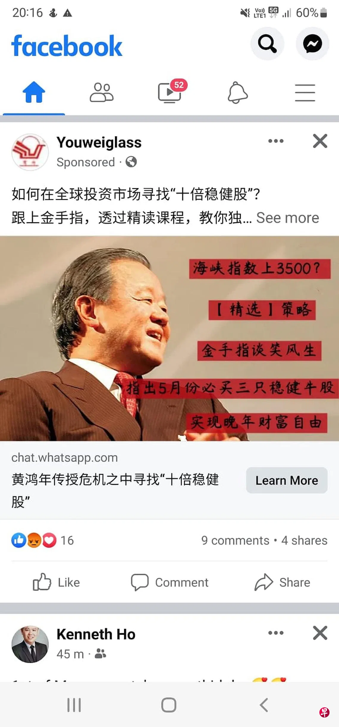 有读者向《联合早报》通报,社交媒体面簿正广传黄鸿年“带领新加坡投资者捕捉三只价值股票”的宣传,并邀请网民加入WhatsApp群组。