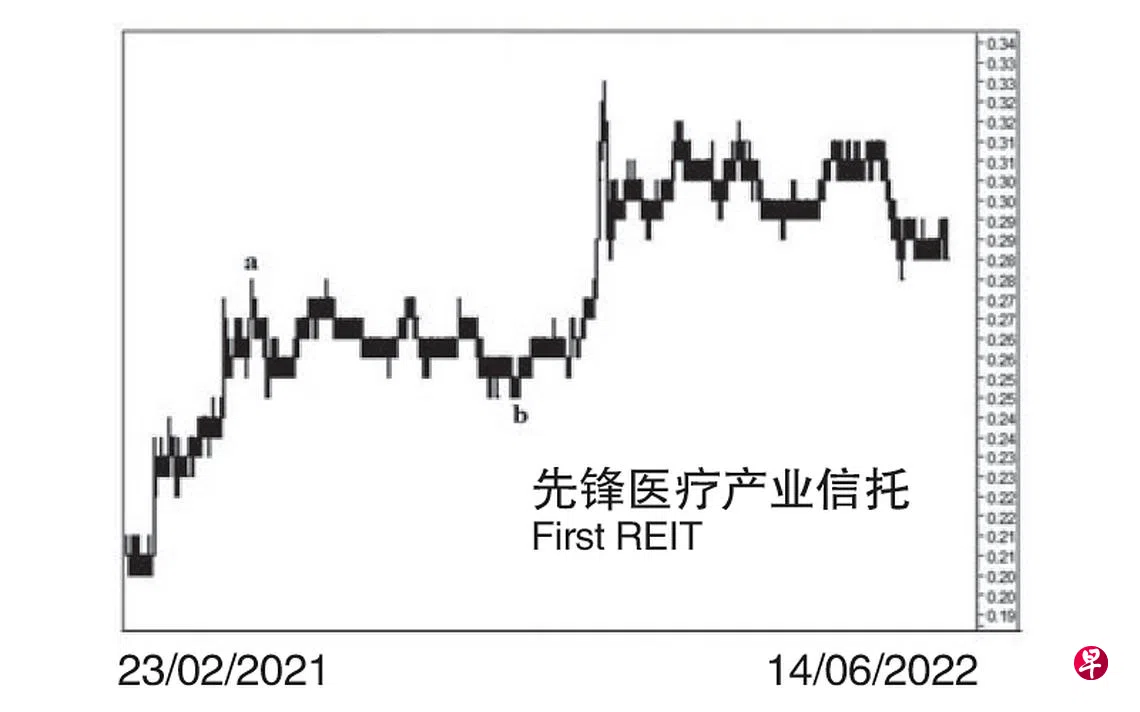 本栏于2019年5月9日曾论及这只股票当时正处(c)波升势,当时股价为0.90元左右。股价过后渐渐上升,同年7月24日升试1.02元,8月1日股价第七次试此价位未果,可惜壮志未酬,无法完成图中的(c)波,随即转而回落。同年8月28日股价下跌至0.90元,遂于当天以“转向”信号完成了(A)波,9月13日股价回升至0.99元,17日股价第三度试此价位并于当天以“转向”信号结束了(B)波,随即进入具三波的(C)波跌势。2020年3月20日股价下探0.455元完成了(a)波,过后回扯至6月1日的0.80元,遂于当天以“主要转向”信号结束了(b)波,并迅速滑落。同年12月31日股价下试0.20元,随即以“转向”信号完成了(c)波,同时为(C)波画下句号,旋出现回扯。2021年5月5日股价上升至0.28元结束了a波,接着于10月6日下试0.25元,此为b波。因此,同年11月25日股价升试0.33元,或许是此次回扯的终结?估计股价将重返跌势,并在跌穿0.25元的支撑点时,出现骤跌。
