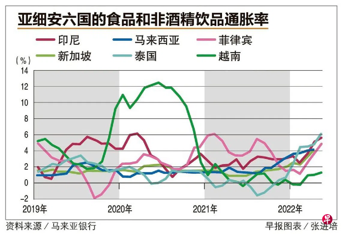 相较于欧盟和美国等发达经济体,亚细安六国的食品和非酒精饮品通胀率处于适中水平,主要是这个区域有几个大型农产品出口国,以及通过津贴和价格控制措施来抑制食品通胀。
