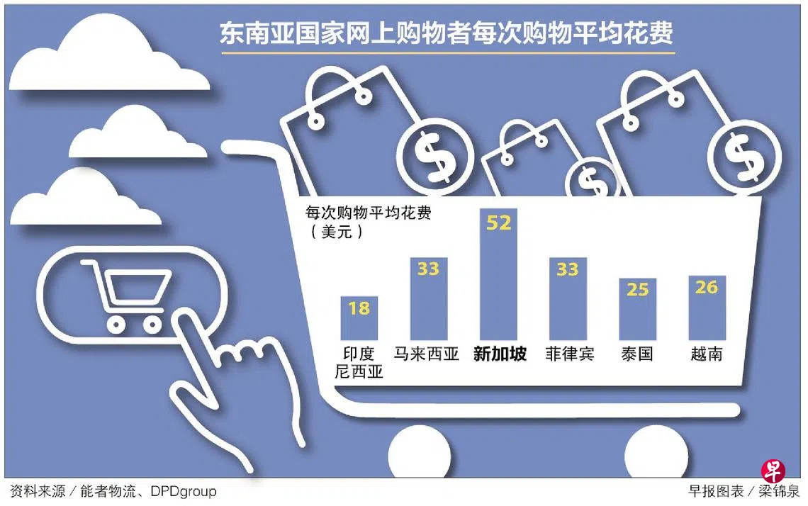 中产阶层增长是扶持网上购物的关键因素。一项针对东南亚六个国家进行的调查显示,人口最少的新加坡,购物者每次网上订货的平均花费最大,为52美元(72新元)。