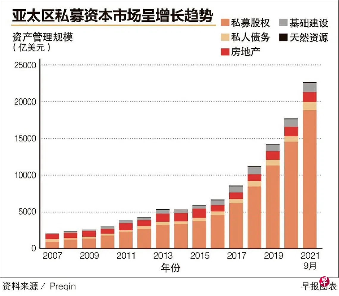 根据另类资产投资研究公司Preqin日前发表的最新报告,亚太私募资本资产管理规模目前为2.8万亿美元(约3.9万亿新元),并且很快会超越欧洲,成为资产管理规模第二大的区域,紧跟在北美之后。