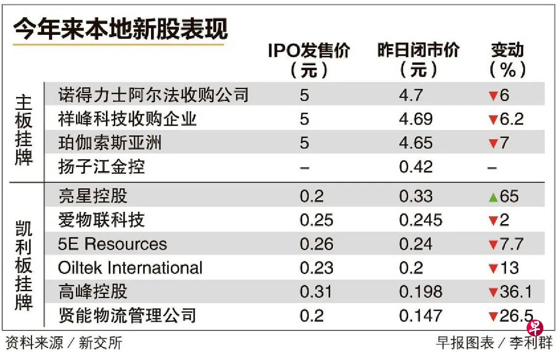 面对市场逆风,本地今年新挂牌的股票绝大多数表现欠佳,纷纷跌破首次公开售股的发售价,最高跌幅逾36%。