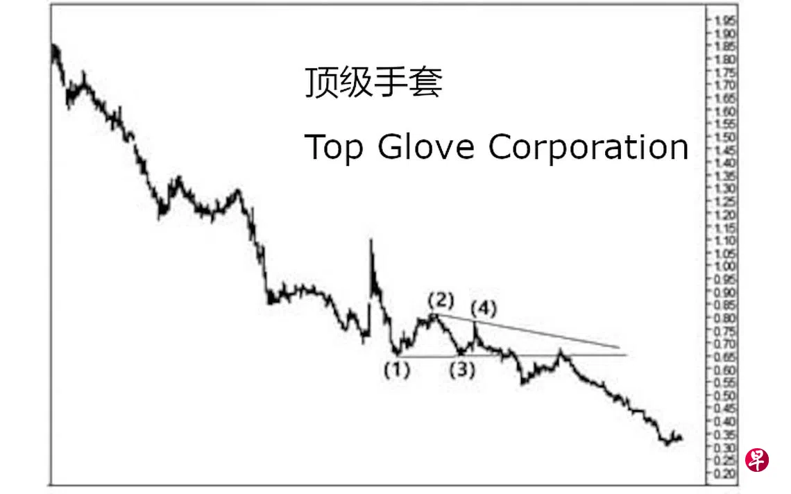 本栏于今年2月10日曾论及这只股票于去年12月15日已经下跌至0.65元,同时渐渐形成一个跌势“三角形”。2月7日股价升试0.785元完成了“三角形”的第(4)点。若以此“三角形”的高,计自其位于0.65元的下限,可测得基本目标为0.485元。当时股价为0.73元左右。果然,股价过后渐渐下滑,2月24日终于跌穿上述位于0.65元的“三角形”下限直抵0.625元。3月1日一度回升至0.675元,可惜昙花一现,3月4日下跌至0.635元,同时在介于0.65元与0.655元间留下缺口。3月7日股价更进一步下试0.595元,又在介于0.635元与0.64元间留下缺口。9日下跌至0.54元,次日,股价再试此价位,随即以“转向”信号进入短期回扯。4月4日股价上升至0.66元旋将上述第二及第一个缺口填补。5月12日下探0.47元,终于完成了上述“三角形”的基本目标。截至6月14日股价已经下跌至0.32元,造成缺口累累。短期回扯,股价当向上填补介于0.38元及0.385元的缺口,过后重返跌势。