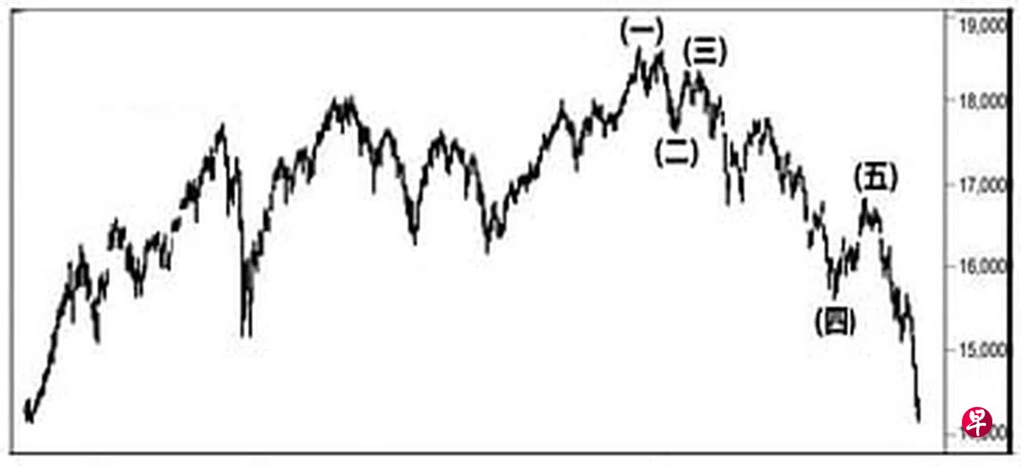 本栏于今年3月23日曾论及指数短期回扯,当填补介于17581.57点与17736.52点及介于17845.01点与17934.40点的缺口。当时指数为17560.36点左右。指数过后于3月30日上升至17770.07点,填补了上述第一个缺口,旋渐渐下跌。4月15日指数骤然下试17004.18点,同时在介于17141.33点与17245.65点间留下缺口,接着下跌至16845.51点;4月21日回扯至17213.66点,遂将此缺口的大部分填补,过后继续下滑。4月27日下试16219.41点,由于跌势甚急,造成介于16427.32点与16644.79点间出现缺口;4月29日指数跳空升试16663.66点,旋将此缺口填补。5月5日上升至16783.78点,次日,竟跳空直试16312.17点,随即在介于16491.11点与16696.12点间留下缺口。5月12日指数终于下探15616.68点完成了图中的第(四)点,接着以三波向上回扯。5月31日回升至16807.77点,遂将上述第五个缺口填补,同时也为第(五)点画下句号。截至7月4日,指数已经下跌至14167.10点,若以图中第(三)及第(四)点价差,计自第(五)点,可测得基本目标为14086.40点了。