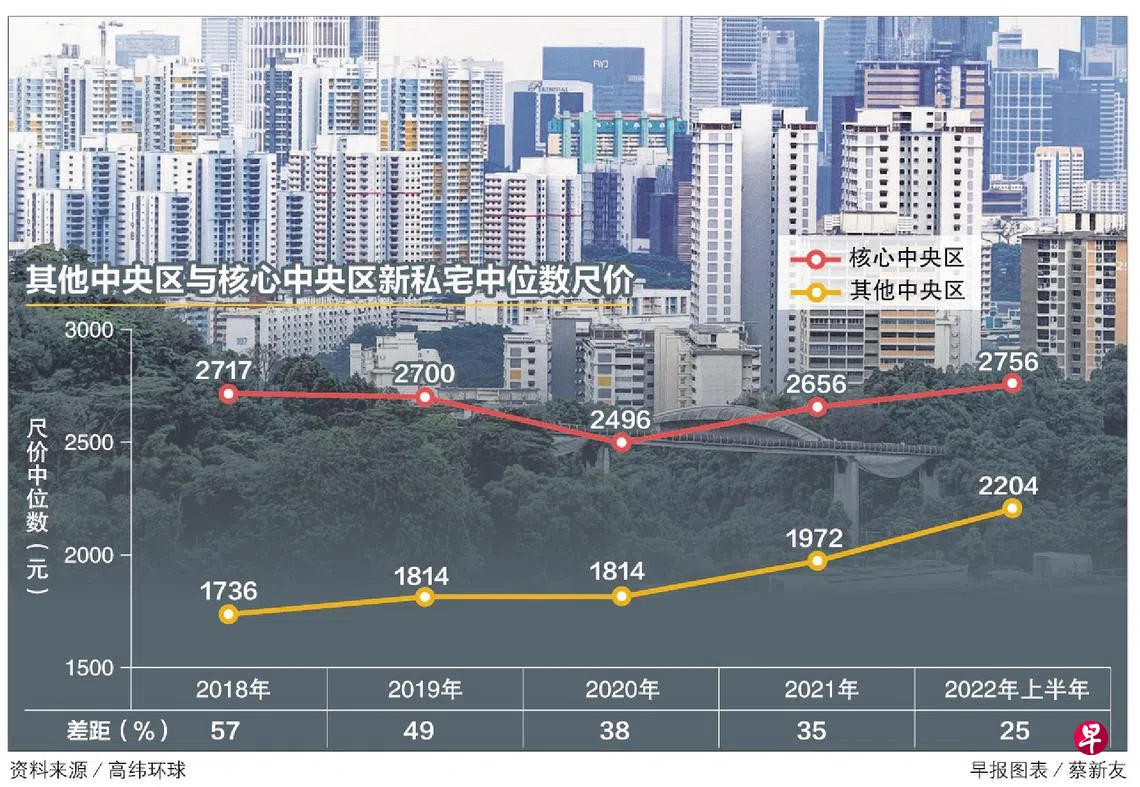 高纬环球(Cushman & Wakefield)研究部提供给《联合早报》的数据显示,在2018年,核心中央区(CCR)新私宅的尺价中位数为2717元,对比其他中央区(RCR)的1736元尺价,高出981元或57%。过后,两者的价格差幅逐年缩小,到了今年上半年,核心中央区的尺价中位数为2756元,其他中央区则是2204元,只相差552元或25%。