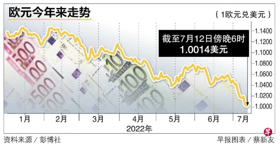 市场担心欧洲出现能源危机,导致欧元在星期二(7月12日)盘中下午5时46分跌至1美元,是自2002年底以来的最低点。截至傍晚6时,欧元兑美元汇率为1.0014。