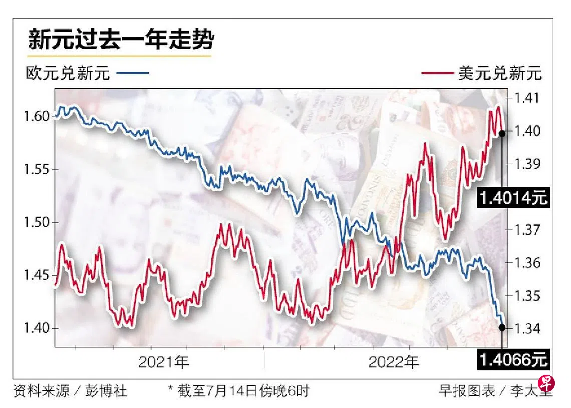 截至星期四(7月14日)傍晚6时,美元兑新元汇率下跌0.23%,1美元报1.4014新元,盘中一度下跌至1.3934新元的两星期低点。不过新元兑美元今年来仍走软约3%。