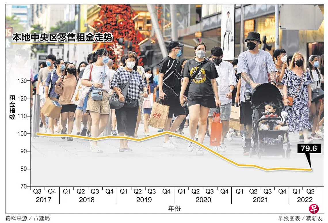 本地零售空间租金继续下滑,第二季中央区租金环比下跌0.5%,跌幅较第一季的0.4%略有扩大,反映冠病疫情限制放宽后,零售市场仍未脱离困境。